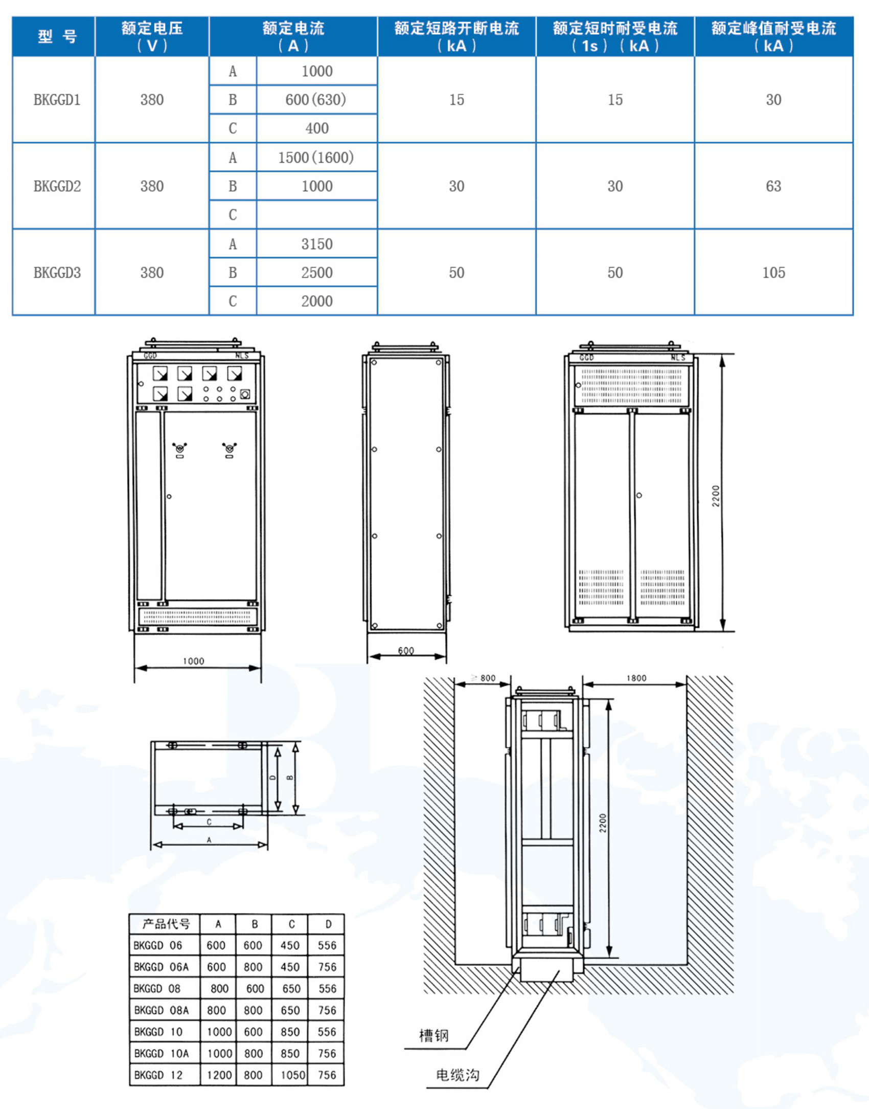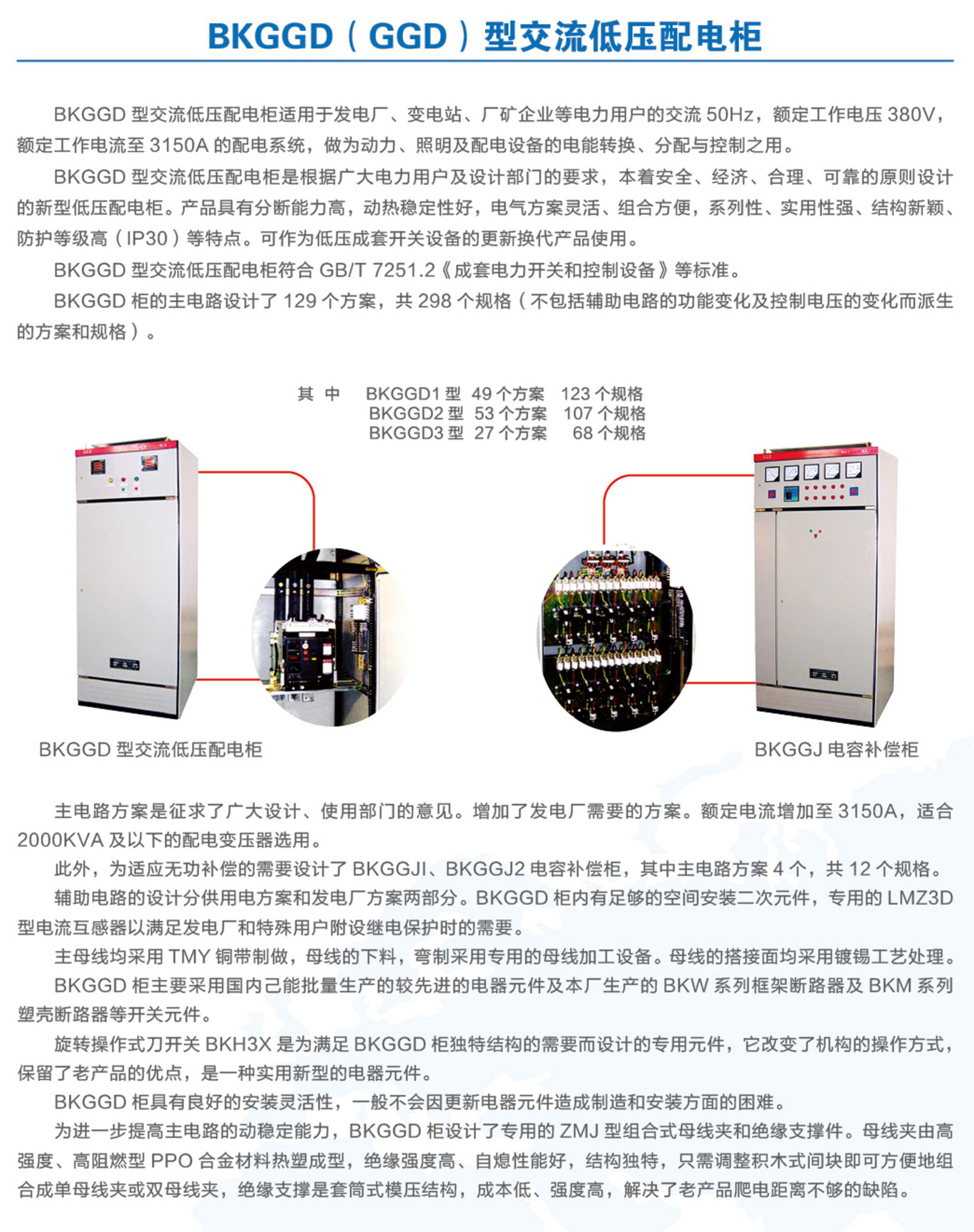 BKGGD型交流低壓配電柜適用于發(fā)電廠、變電站、廠礦企業(yè)等電力用戶的交流50Hz,額定工作電壓380V,額定工作電流至3150A的配電系統(tǒng),做為動(dòng)力、照明及配電設(shè)備的電能轉(zhuǎn)換、分配與控制之用。BKGGD型交流低壓配電柜是根據(jù)廣大電力用戶及設(shè)計(jì)部門的要求,本著安全、經(jīng)濟(jì)、合理、可靠的原則設(shè)計(jì)的新型低壓配電柜。產(chǎn)品具有分?jǐn)嗄芰Ω?,?dòng)熱穩(wěn)定性好,電氣方案靈活、組合方便,系列性、實(shí)用性強(qiáng)、結(jié)構(gòu)新穎、防護(hù)等級(jí)高等特點(diǎn)??勺鳛榈蛪撼商组_關(guān)設(shè)備的更新?lián)Q代產(chǎn)品使用。