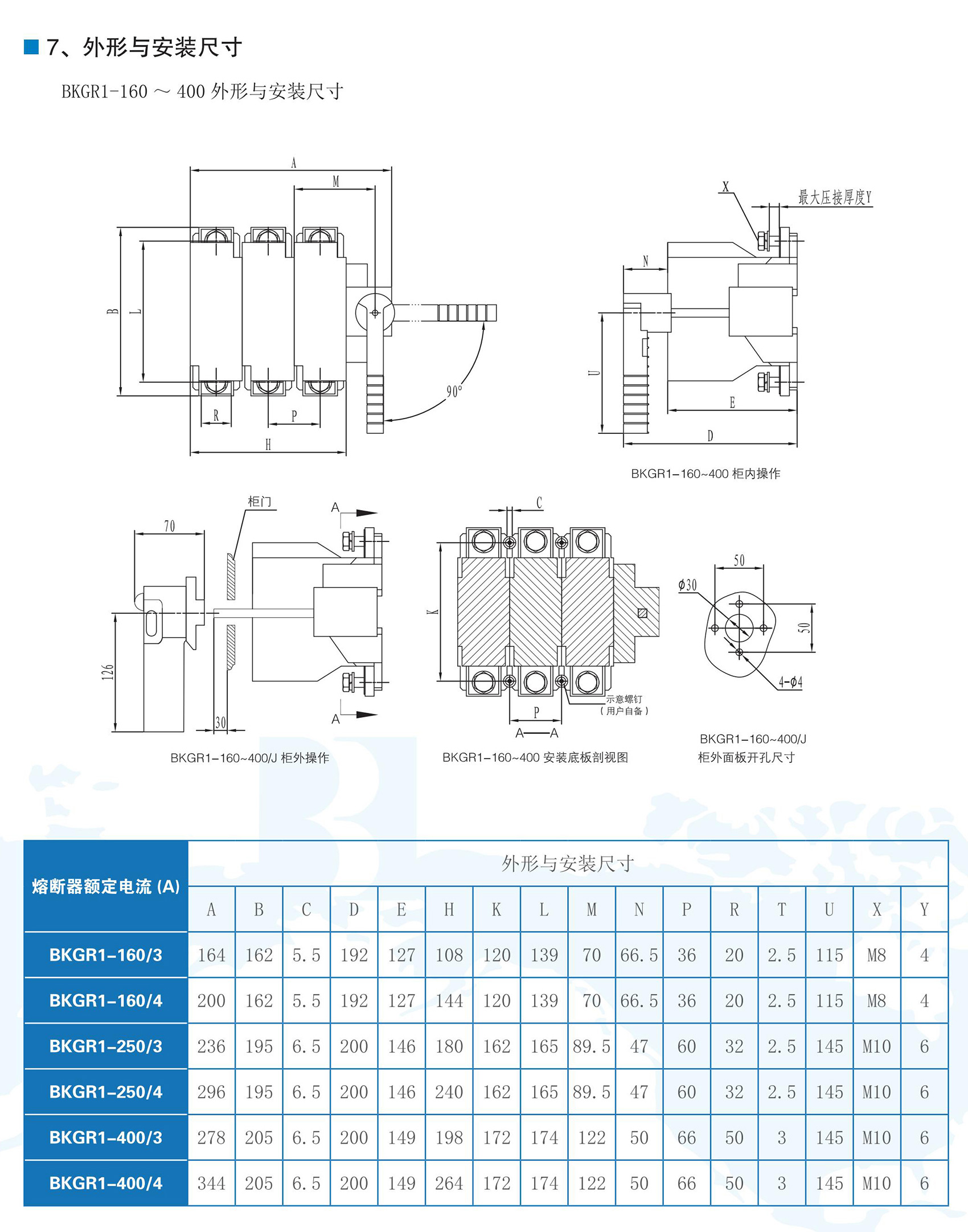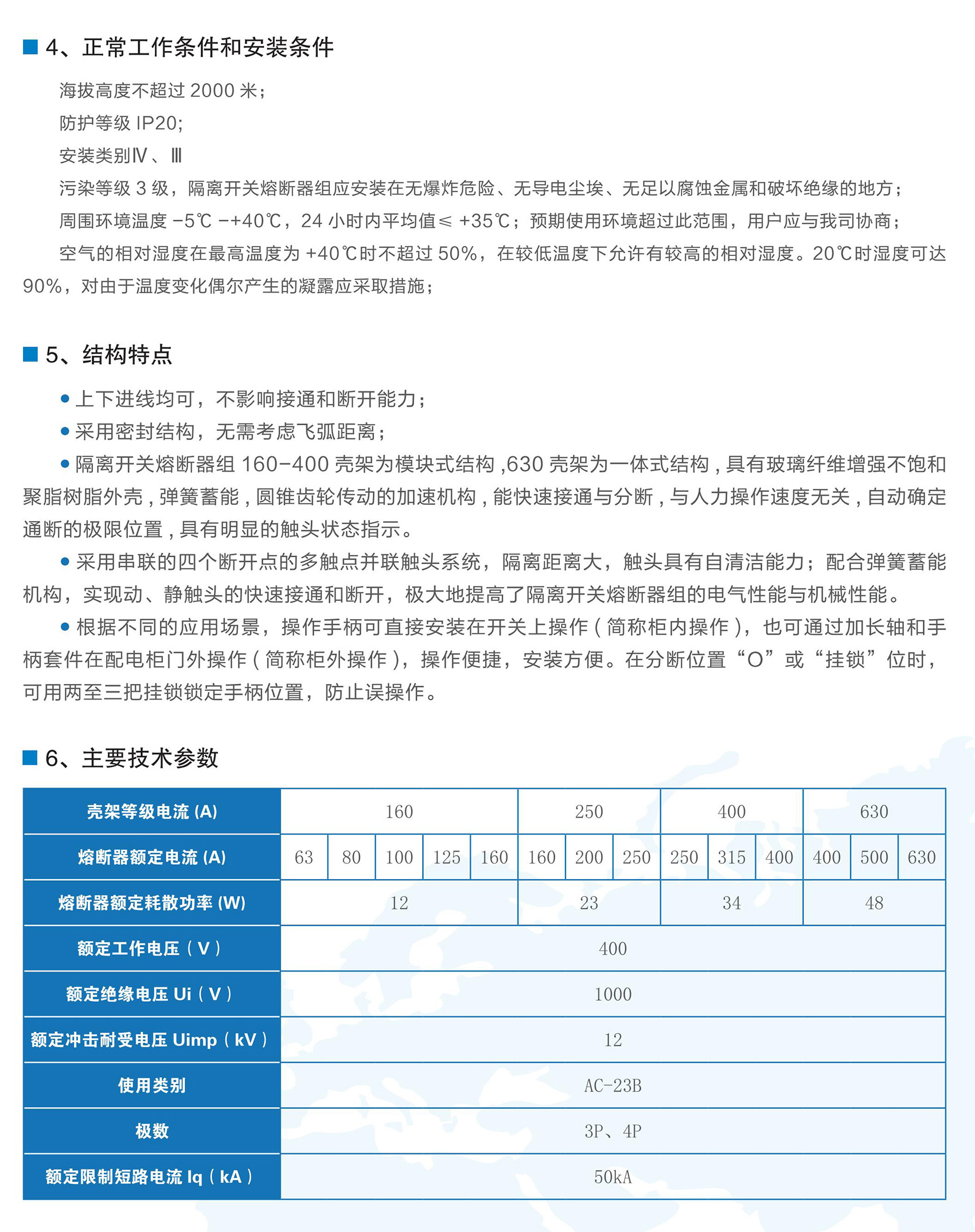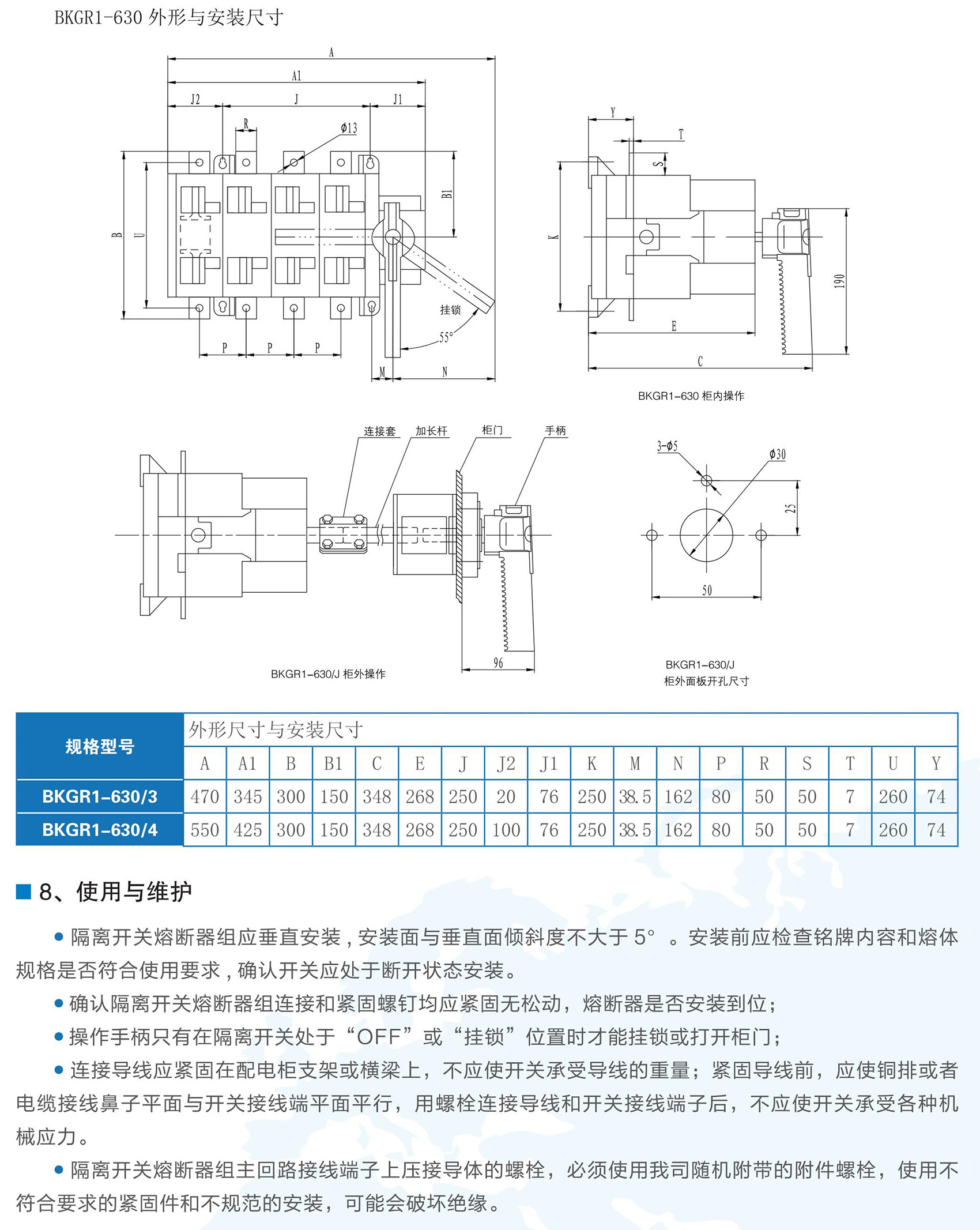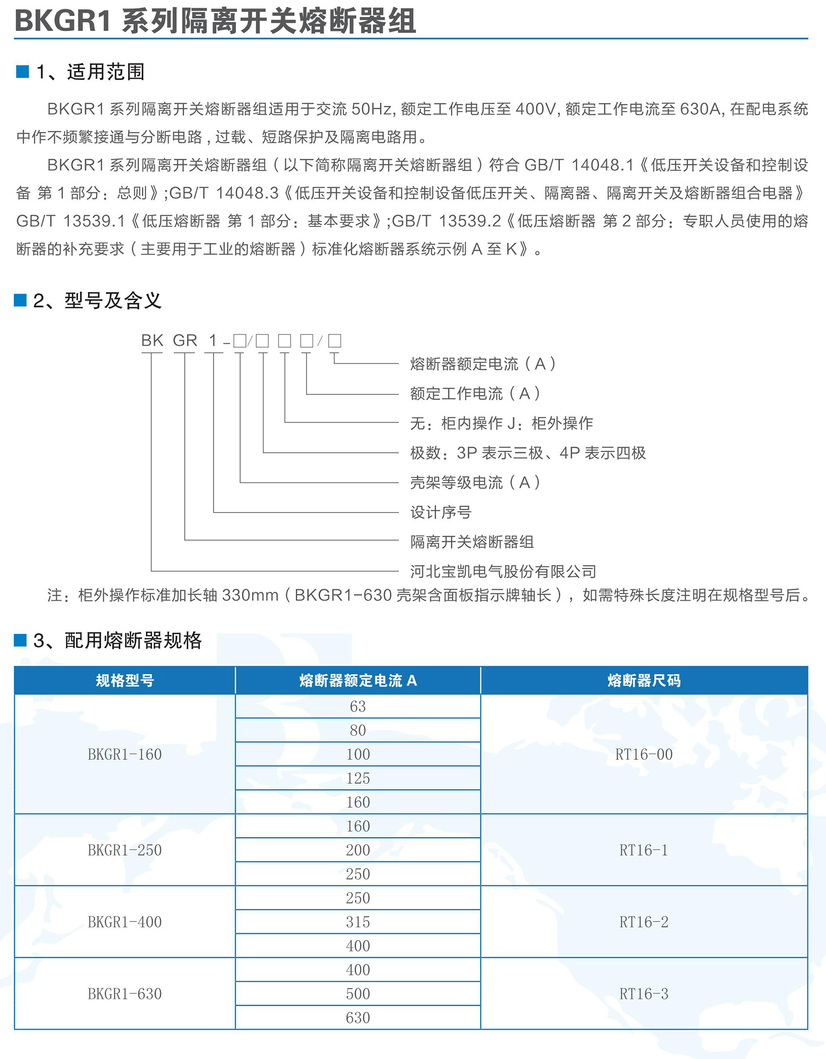 BKGR1系列隔離開關(guān)熔斷器組適用于交流50Hz,額定工作電壓為AC400V,額定工作電流63A-630A的低壓配電或電動機(jī)網(wǎng)絡(luò)中,作為不頻繁接通、分?jǐn)嚯娐芳熬€路的隔離之用??商峁┒搪?、過載保護(hù)功能。BKGR1系列隔離開關(guān)熔斷器組符合GB/T 14048.3《低壓開關(guān)設(shè)備和控制設(shè)備低壓開關(guān)、隔離器、隔離開關(guān)及熔斷器組合電器》。