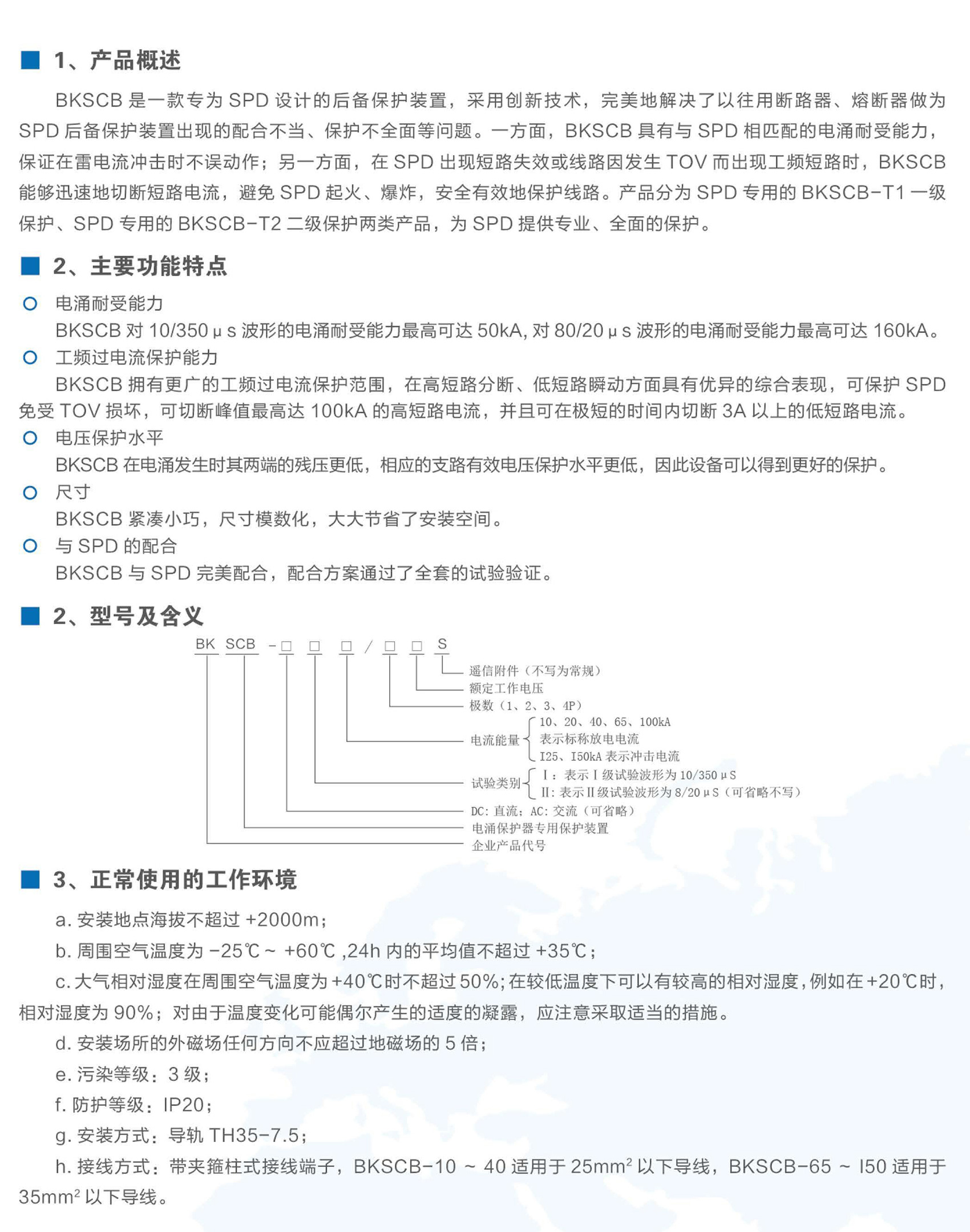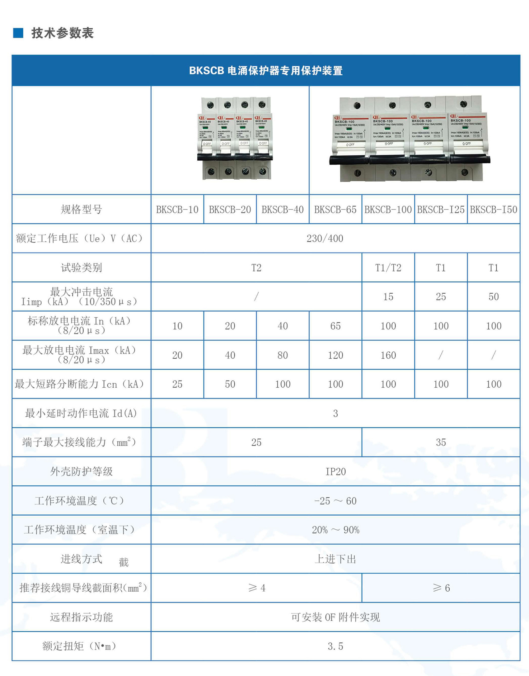 BKSCB系列電涌保護器專用保護裝置適用于交流50Hz/60Hz、額定工作電壓至400V,需安裝SPD(防雷保護器)設(shè)備的電路中,為試驗類別為Ⅰ類和II類的電涌保護器提供專業(yè)的后備保護。本產(chǎn)品符合NB/T 42150標(biāo)準(zhǔn)。