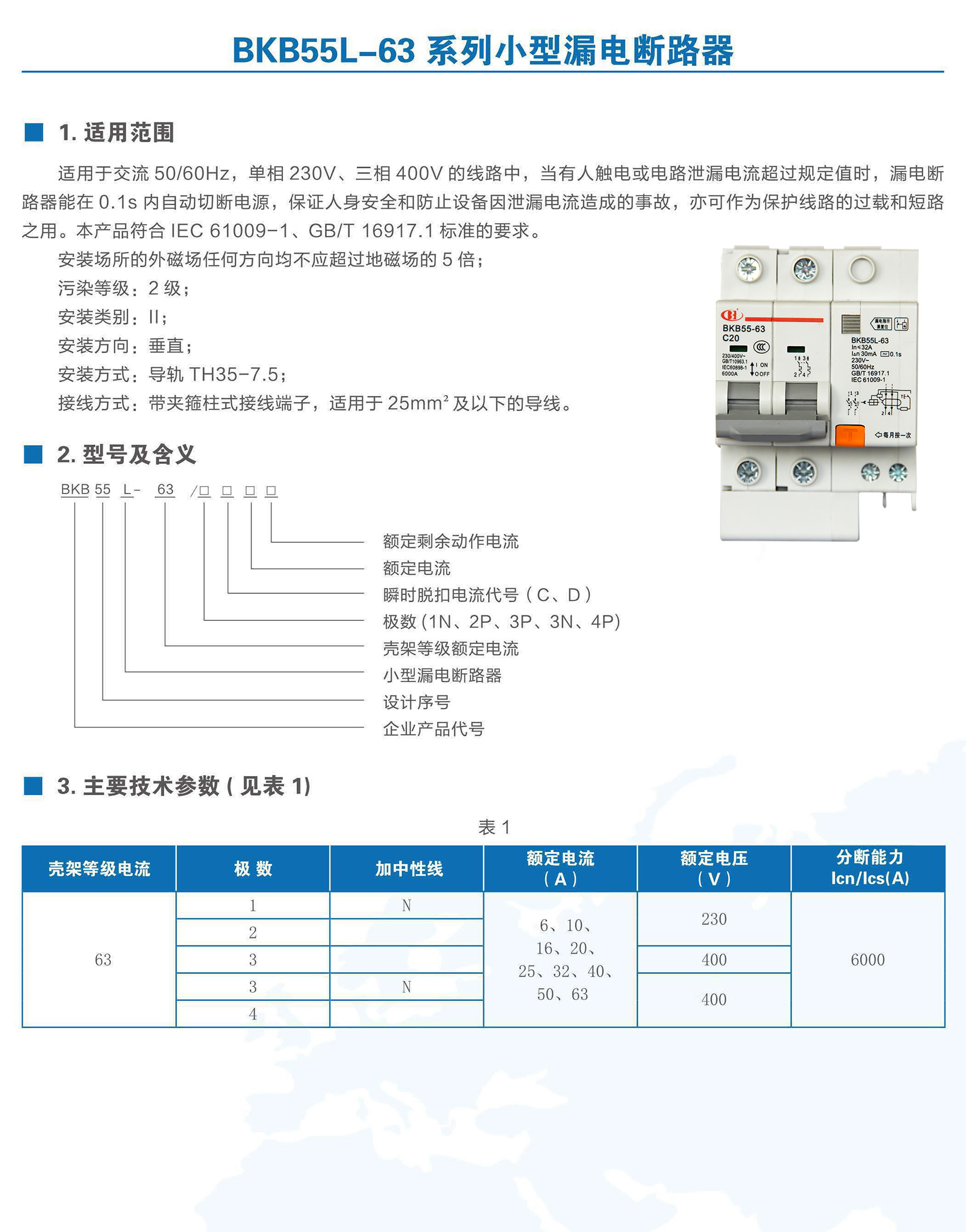 BKB55L-63系列帶剩余電流保護小型斷路器適用于交流50/60Hz、額定電壓至400V,額定電流6~63A 的線路中。作為人身觸電和設備漏電保護之用,并可用于線路和電氣設備的過載以及短路保護。在正常情況下亦可用于不頻繁的通斷操作。本產(chǎn)品符合GB/T 16917.1、IEC 61009-1標準。