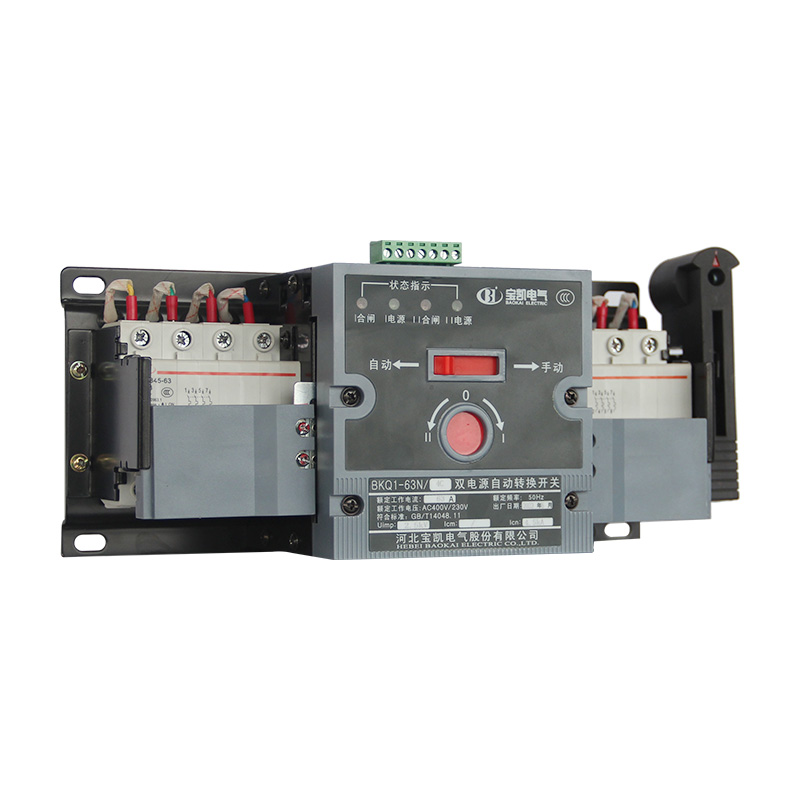 BKQ1-63N末端一體式雙電源自動(dòng)轉(zhuǎn)換開(kāi)關(guān),適用于交流額定工作電壓400V及以下、額定頻率50Hz,額定工作電流63A及以下的雙電源切換供電系統(tǒng);產(chǎn)品具有電氣聯(lián)鎖與機(jī)械聯(lián)鎖,確保兩路電源不能同時(shí)供電;切換可靠,手動(dòng)、自動(dòng)切換均可;新型機(jī)構(gòu)驅(qū)動(dòng)完成切換過(guò)程,具有平衡、無(wú)噪音、沖擊力小的優(yōu)點(diǎn);廣泛適用于醫(yī)院、商場(chǎng)、銀行、消防、通訊、高層建筑等不允許停電的供電場(chǎng)所。產(chǎn)品符合GB/T 14048.11《低壓開(kāi)關(guān)設(shè)備和控制設(shè)備 第 6-1 部分:多功能電器 轉(zhuǎn)換開(kāi)關(guān)電器》。